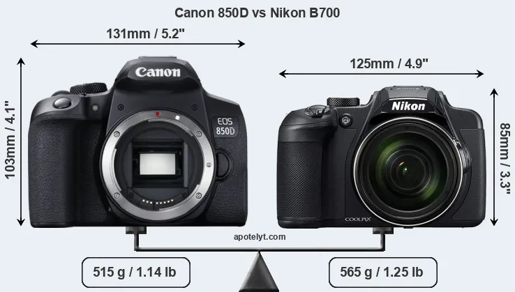 The physical size and weight of the Canon 850D and the Nikon B700 are illustrated in the side-by-side display below. The two cameras are presented according to their relative size. Three consecutive perspectives from the front, the top, and the back are available. All width, height and depth dimensions are rounded to the nearest millimeter.