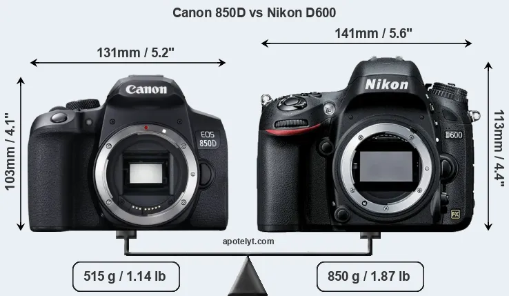 An illustration of the physical size and weight of the Canon 850D and the Nikon D600 is provided in the side-by-side display below. The two cameras are presented according to their relative size. Three consecutive perspectives from the front, the top, and the back are available. All size dimensions are rounded to the nearest millimeter.