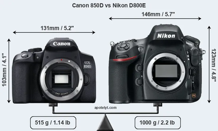The side-by-side display below illustrates the physical size and weight of the Canon 850D and the Nikon D800E. The two cameras are presented according to their relative size. Three consecutive views from the front, the top, and the rear side are shown. All width, height and depth dimensions are rounded to the nearest millimeter.