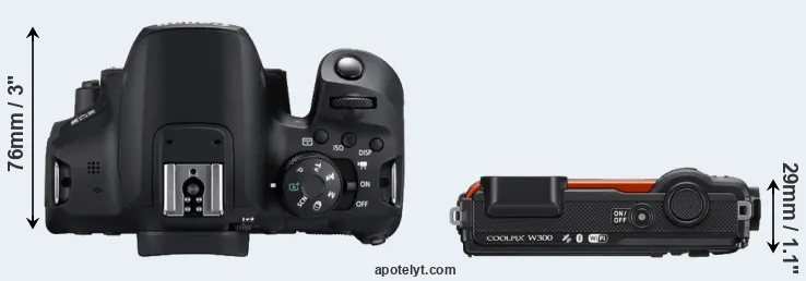 Going beyond this snapshot of core features and characteristics, what are the differences between the Canon EOS 850D and the Nikon Coolpix W300? Which one should you buy? Read on to find out how these two cameras compare with respect to their body size, their imaging sensors, their shooting features, their input-output connections, and their reception by expert reviewers.