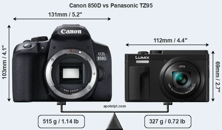 The physical size and weight of the Canon 850D and the Panasonic TZ95 are illustrated in the side-by-side display below. The two cameras are presented according to their relative size. Three successive views from the front, the top, and the rear are shown. All width, height and depth dimensions are rounded to the nearest millimeter.
