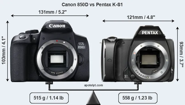 The physical size and weight of the Canon 850D and the Pentax K-S1 are illustrated in the side-by-side display below. The two cameras are presented according to their relative size. Three consecutive perspectives from the front, the top, and the back are available. All size dimensions are rounded to the nearest millimeter.