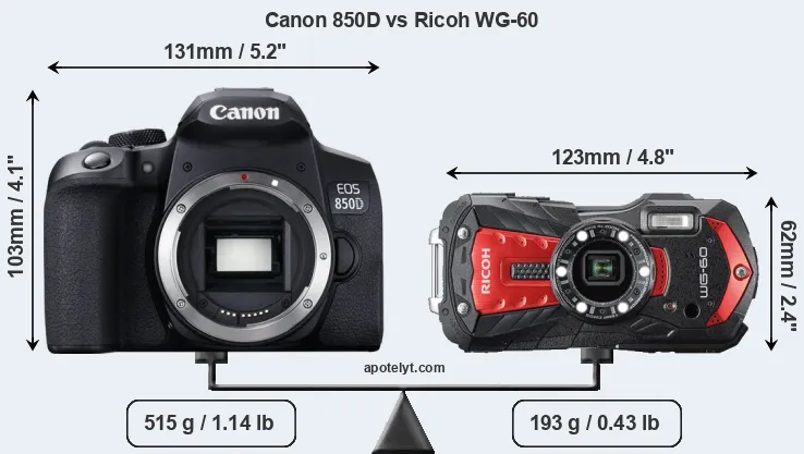 The physical size and weight of the Canon 850D and the Ricoh WG-60 are illustrated in the side-by-side display below. The two cameras are presented according to their relative size. Three successive views from the front, the top, and the rear are shown. All width, height and depth measures are rounded to the nearest millimeter.