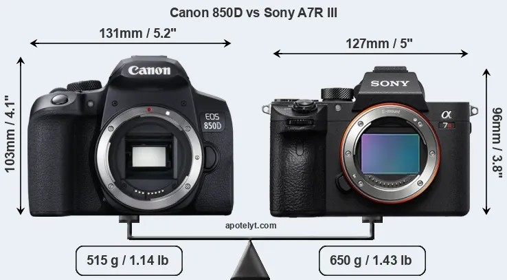 If the front view area (width x height) of the cameras is taken as an aggregate measure of their size, the Sony A7R III is notably smaller (10 percent) than the Canon 850D. However, the A7R III is markedly heavier (26 percent) than the 850D. It is noteworthy in this context that the A7R III is splash and dust-proof, while the 850D does not feature any corresponding weather-sealing.