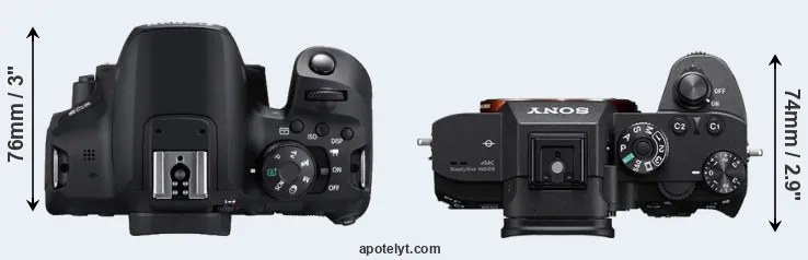 The physical size and weight of the Canon 850D and the Sony A7R III are illustrated in the side-by-side display below. The two cameras are presented according to their relative size. Three consecutive views from the front, the top, and the rear side are shown. All width, height and depth dimensions are rounded to the nearest millimeter.