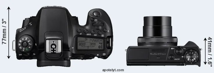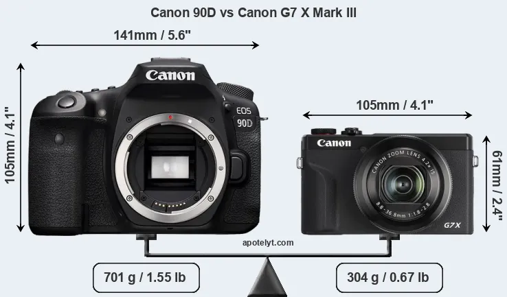 The side-by-side display below illustrates the physical size and weight of the Canon 90D and the Canon G7 X Mark III. The two cameras are presented according to their relative size. Three consecutive perspectives from the front, the top, and the back are available. All width, height and depth measures are rounded to the nearest millimeter.