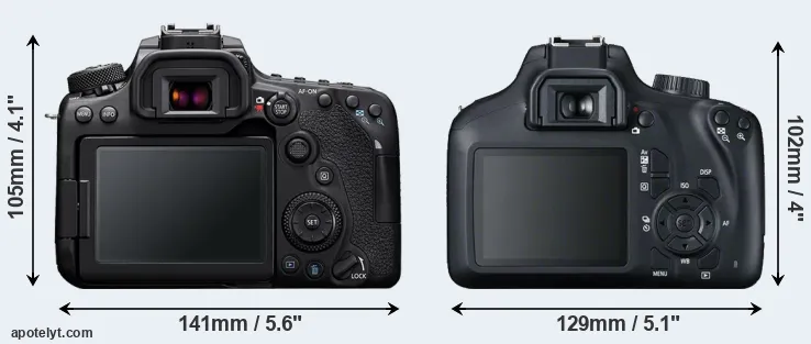 The side-by-side display below illustrates the physical size and weight of the Canon 90D and the Canon T100. The two cameras are presented according to their relative size. Three successive views from the front, the top, and the rear are shown. All width, height and depth measures are rounded to the nearest millimeter.