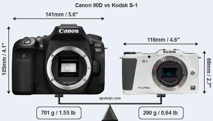 An illustration of the physical size and weight of the Canon 90D and the Kodak S-1 is provided in the side-by-side display below. The two cameras are presented according to their relative size. Three consecutive views from the front, the top, and the rear side are shown. All width, height and depth measures are rounded to the nearest millimeter.