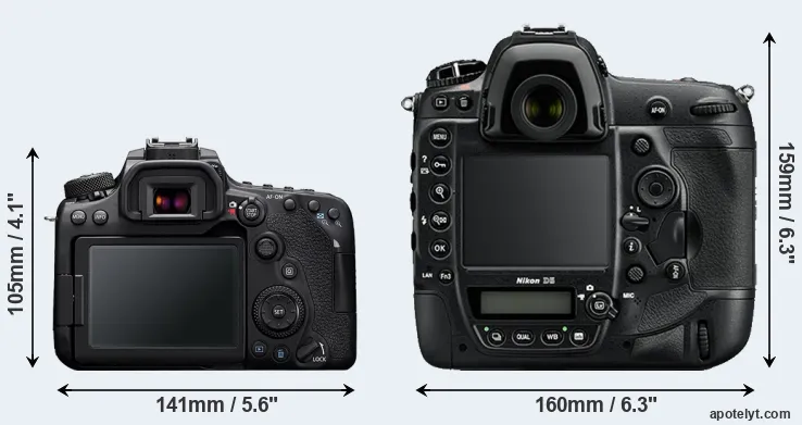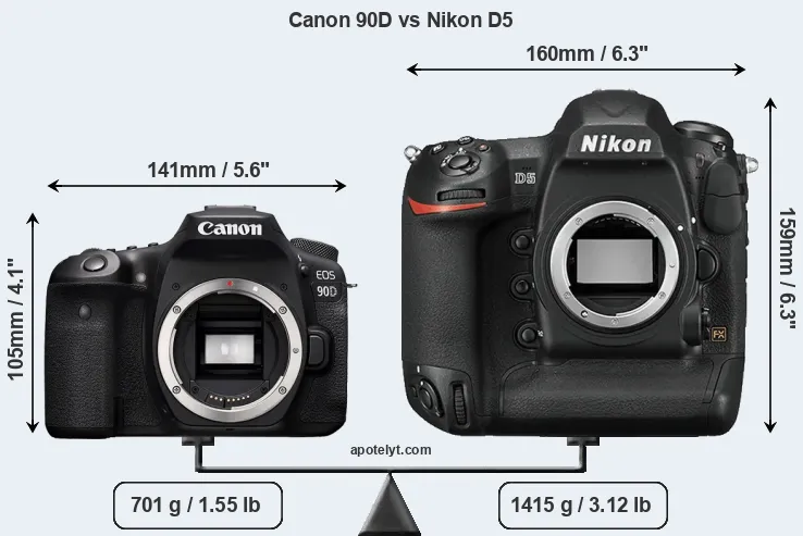 An illustration of the physical size and weight of the Canon 90D and the Nikon D5 is provided in the side-by-side display below. The two cameras are presented according to their relative size. Three successive views from the front, the top, and the rear are shown. All size dimensions are rounded to the nearest millimeter.