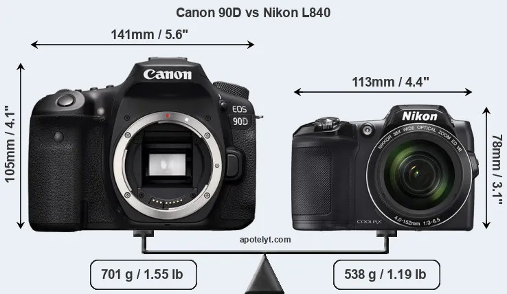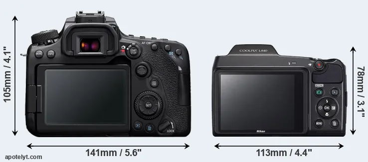 The side-by-side display below illustrates the physical size and weight of the Canon 90D and the Nikon L840. The two cameras are presented according to their relative size. Three consecutive perspectives from the front, the top, and the back are available. All size dimensions are rounded to the nearest millimeter.