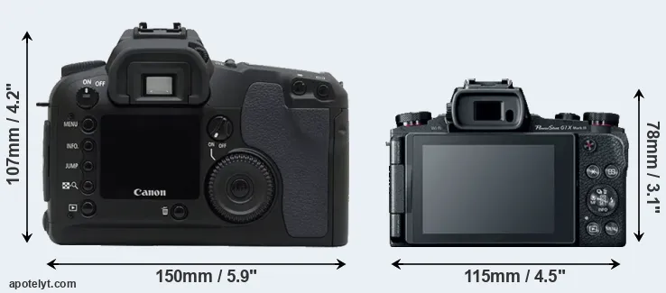 If the front view area (width x height) of the cameras is taken as an aggregate measure of their size, the Canon G1 X Mark III is considerably smaller (44 percent) than the Canon D30. It is noteworthy in this context that the G1X Mark III is splash and dust-proof, while the D30 does not feature any corresponding weather-sealing.