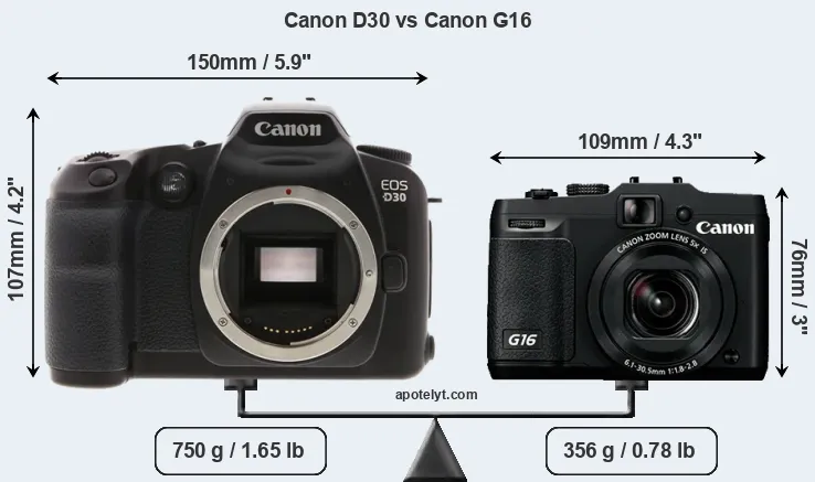 The above size and weight comparisons are to some extent incomplete and possibly misleading, as the G16 has a lens built in, whereas the D30 is an interchangeable lens camera that requires a separate lens. Attaching the latter will add extra weight and bulk to the setup. You can compare the optics available for the D30 and their specifications in the Canon EF Lens Catalog.