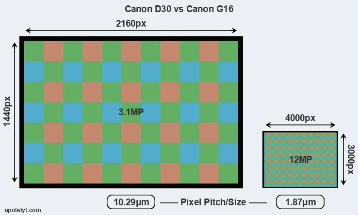 Despite having a smaller sensor, the G16 offers a higher resolution of 12 megapixels, compared with 3.1 MP of the D30. This megapixels advantage comes at the cost of a higher pixel density and a smaller size of the individual pixel (with a pixel pitch of 1.87μm versus 10.29μm for the D30). However, it should be noted that the G16 is much more recent (by 13 years and 3 months) than the D30, and its sensor will have benefitted from technological advances during this time that make it possible to gather light more efficiently.