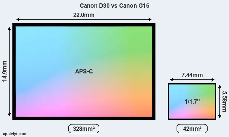 Of the two cameras under consideration, the Canon D30 features an APS-C sensor and the Canon G16 a 1/1.7-inch sensor. The sensor area in the G16 is 87 percent smaller. As a result of these sensor size differences, the cameras have a format factor of, respectively, 1.6 and 4.65. The sensor in the D30 has a native 3:2 aspect ratio, while the one in the G16 offers a 4:3 aspect.