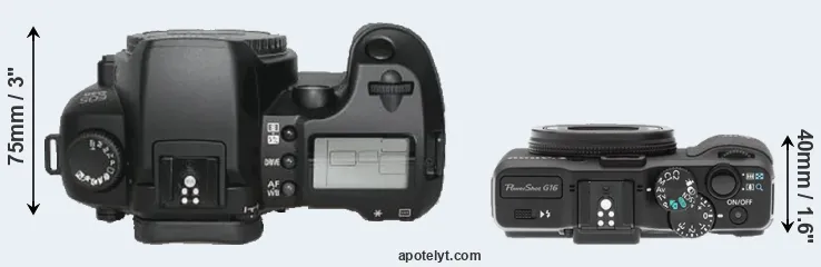 The physical size and weight of the Canon D30 and the Canon G16 are illustrated in the side-by-side display below. The two cameras are presented according to their relative size. Three successive views from the front, the top, and the rear are shown. All width, height and depth dimensions are rounded to the nearest millimeter.