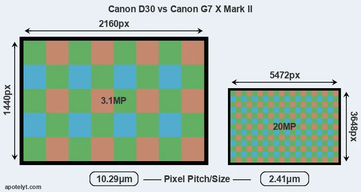Despite having a smaller sensor, the G7X Mark II offers a higher resolution of 20 megapixels, compared with 3.1 MP of the D30. This megapixels advantage comes at the cost of a higher pixel density and a smaller size of the individual pixel (with a pixel pitch of 2.41μm versus 10.29μm for the D30). However, it should be noted that the G7X Mark II is much more recent (by 15 years and 9 months) than the D30, and its sensor will have benefitted from technological advances during this time that make it possible to gather light more efficiently.