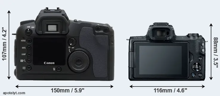 If the front view area (width x height) of the cameras is taken as an aggregate measure of their size, the Canon M50 is considerably smaller (36 percent) than the Canon D30. Moreover, the M50 is substantially lighter (48 percent) than the D30. In this context, it is worth noting that neither the D30 nor the M50 are weather-sealed.