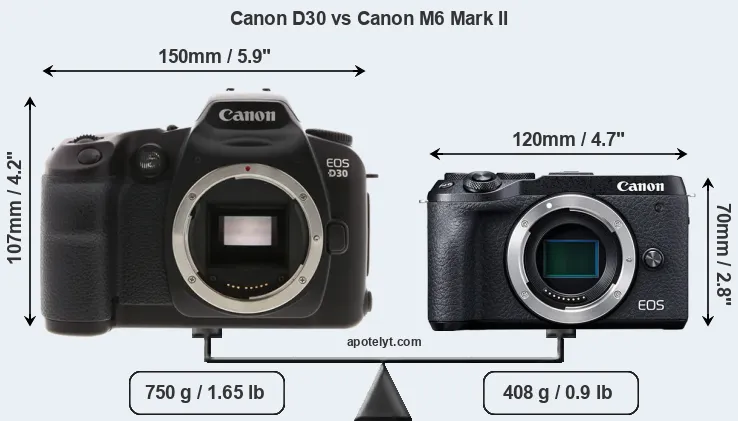 If the front view area (width x height) of the cameras is taken as an aggregate measure of their size, the Canon M6 Mark II is considerably smaller (48 percent) than the Canon D30. Moreover, the M6 Mark II is substantially lighter (46 percent) than the D30. In this context, it is worth noting that neither the D30 nor the M6 Mark II are weather-sealed.