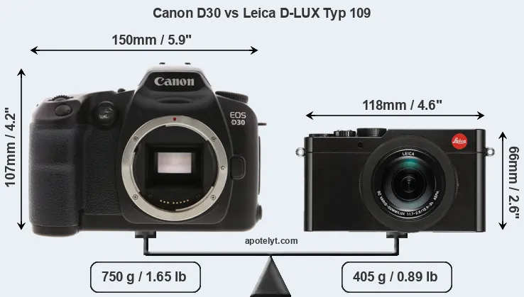 The side-by-side display below illustrates the physical size and weight of the Canon D30 and the Leica D-LUX Typ 109. The two cameras are presented according to their relative size. Three consecutive perspectives from the front, the top, and the back are available. All width, height and depth dimensions are rounded to the nearest millimeter.