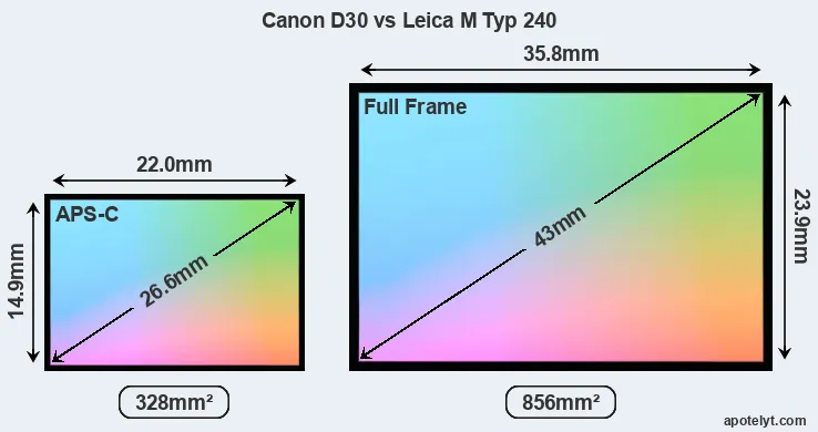 Of the two cameras under consideration, the Canon D30 features an APS-C sensor and the Leica M Typ 240 a full frame sensor. The sensor area in the M Typ 240 is 161 percent bigger. As a result of these sensor size differences, the cameras have a format factor of, respectively, 1.6 and 1.0. Both cameras have a native aspect ratio (sensor width to sensor height) of 3:2.