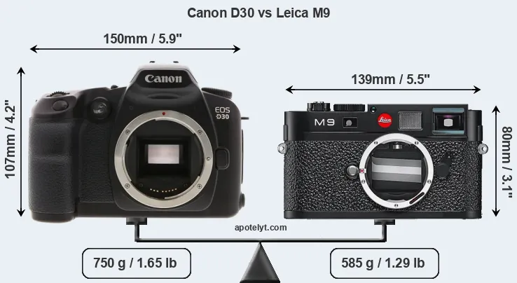 The physical size and weight of the Canon D30 and the Leica M9 are illustrated in the side-by-side display below. The two cameras are presented according to their relative size. Three successive views from the front, the top, and the rear are shown. All size dimensions are rounded to the nearest millimeter.