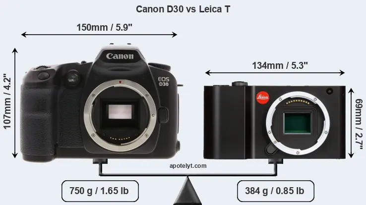If the front view area (width x height) of the cameras is taken as an aggregate measure of their size, the Leica T is considerably smaller (42 percent) than the Canon D30. Moreover, the T Typ 701 is substantially lighter (49 percent) than the D30. In this context, it is worth noting that neither the D30 nor the T Typ 701 are weather-sealed.