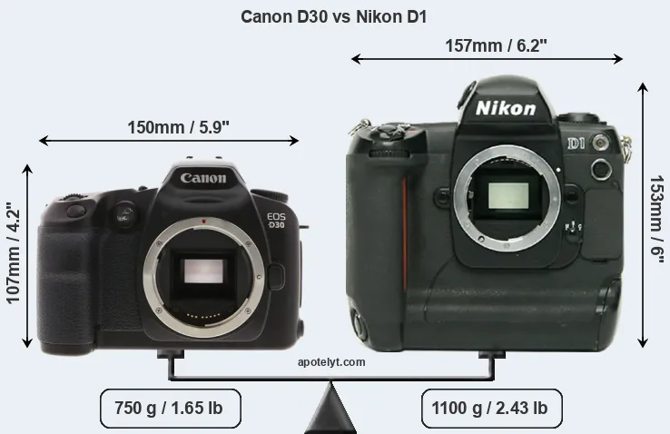 If the front view area (width x height) of the cameras is taken as an aggregate measure of their size, the Nikon D1 is considerably larger (50 percent) than the Canon D30. Moreover, the D1 is substantially heavier (47 percent) than the D30. It is noteworthy in this context that the D1 is splash and dust-proof, while the D30 does not feature any corresponding weather-sealing.