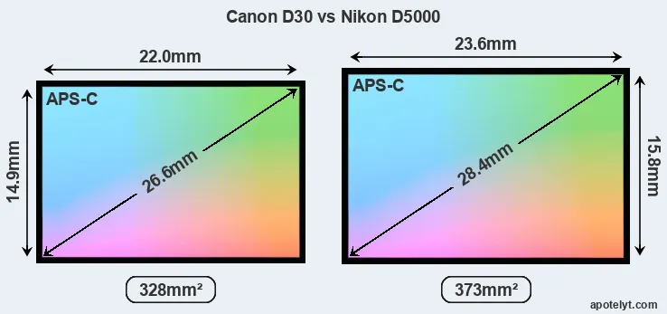 Both cameras under consideration feature an APS-C sensor, but their sensors differ slightly in size. The sensor area in the D5000 is 14 percent bigger. As a result of these sensor size differences, the cameras have format factors, respectively, of 1.6 (D30) and 1.5. Both cameras have a native aspect ratio (sensor width to sensor height) of 3:2.