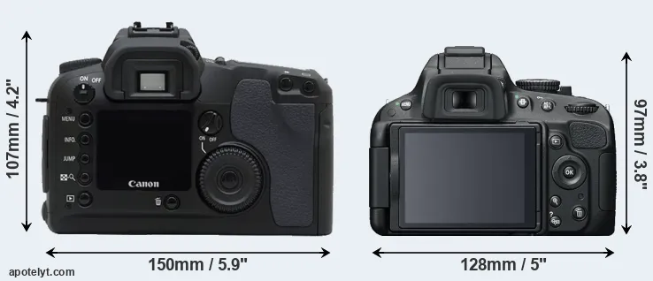 The side-by-side display below illustrates the physical size and weight of the Canon D30 and the Nikon D5100. The two cameras are presented according to their relative size. Three consecutive perspectives from the front, the top, and the back are available. All width, height and depth dimensions are rounded to the nearest millimeter.