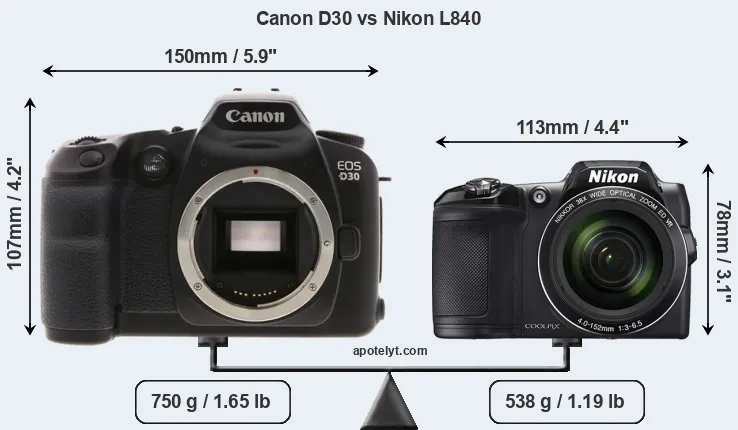 An illustration of the physical size and weight of the Canon D30 and the Nikon L840 is provided in the side-by-side display below. The two cameras are presented according to their relative size. Three consecutive views from the front, the top, and the rear side are shown. All width, height and depth dimensions are rounded to the nearest millimeter.