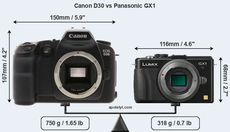If the front view area (width x height) of the cameras is taken as an aggregate measure of their size, the Panasonic GX1 is considerably smaller (51 percent) than the Canon D30. Moreover, the GX1 is substantially lighter (58 percent) than the D30. In this context, it is worth noting that neither the D30 nor the GX1 are weather-sealed.