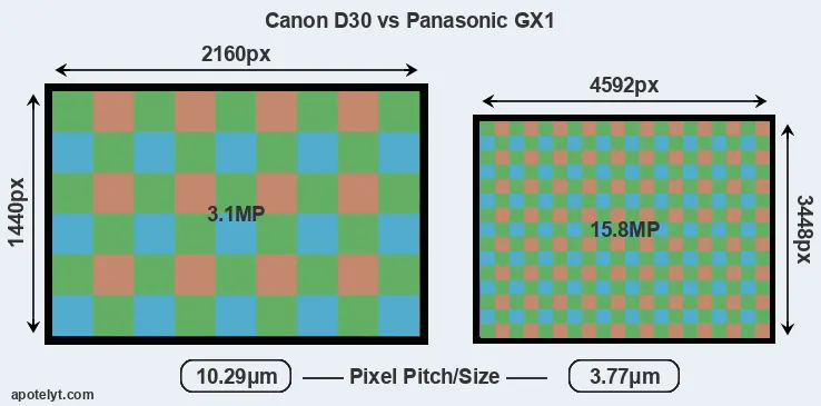 Despite having a smaller sensor, the GX1 offers a higher resolution of 15.8 megapixels, compared with 3.1 MP of the D30. This megapixels advantage comes at the cost of a higher pixel density and a smaller size of the individual pixel (with a pixel pitch of 3.77μm versus 10.29μm for the D30). However, it should be noted that the GX1 is much more recent (by 11 years and 5 months) than the D30, and its sensor will have benefitted from technological advances during this time that make it possible to gather light more efficiently.