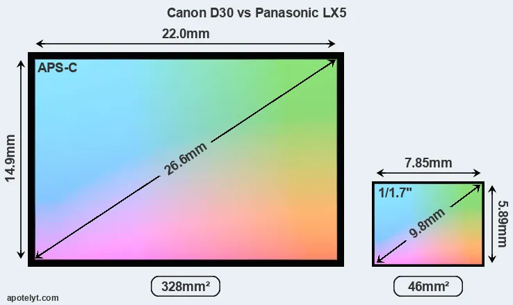 Of the two cameras under consideration, the Canon D30 features an APS-C sensor and the Panasonic LX5 a 1/1.7-inch sensor. The sensor area in the LX5 is 86 percent smaller. As a result of these sensor size differences, the cameras have a format factor of, respectively, 1.6 and 4.4. The sensor in the D30 has a native 3:2 aspect ratio, while the one in the LX5 offers a 4:3 aspect. The LX5 has the particularity of featuring a switch that allows to toggle between multiple aspect ratios, while maintaining the same field of view and full image resolution.