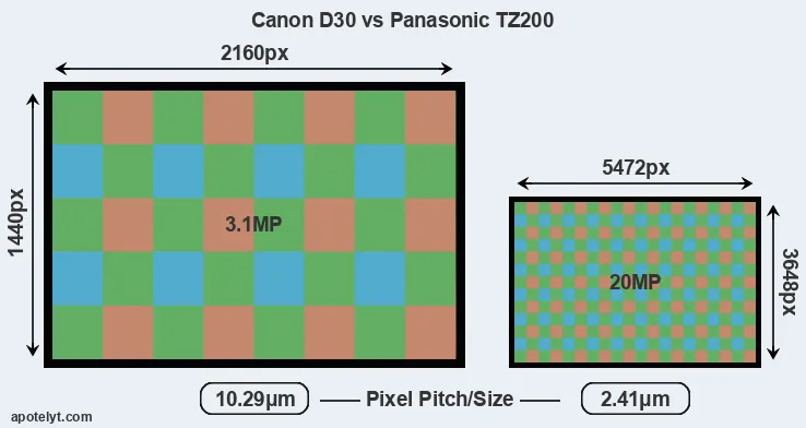 Despite having a smaller sensor, the TZ200 offers a higher resolution of 20 megapixels, compared with 3.1 MP of the D30. This megapixels advantage comes at the cost of a higher pixel density and a smaller size of the individual pixel (with a pixel pitch of 2.41μm versus 10.29μm for the D30). However, it should be noted that the TZ200 is much more recent (by 17 years and 9 months) than the D30, and its sensor will have benefitted from technological advances during this time that make it possible to gather light more efficiently.