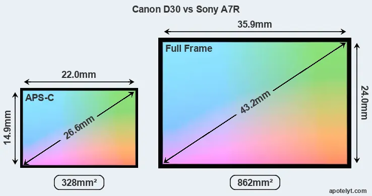 Of the two cameras under consideration, the Canon D30 features an APS-C sensor and the Sony A7R a full frame sensor. The sensor area in the A7R is 163 percent bigger. As a result of these sensor size differences, the cameras have a format factor of, respectively, 1.6 and 1.0. Both cameras have a native aspect ratio (sensor width to sensor height) of 3:2.