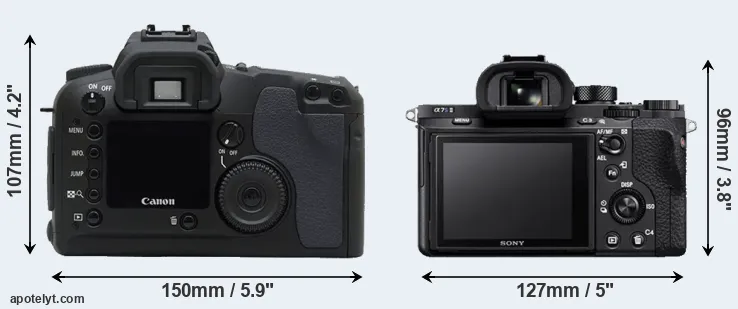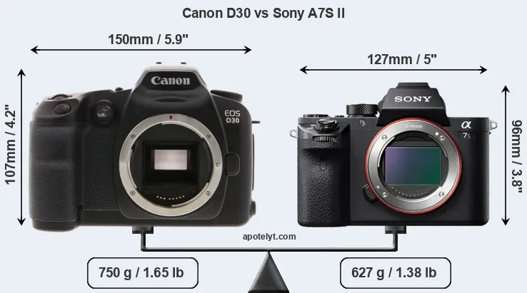 The physical size and weight of the Canon D30 and the Sony A7S II are illustrated in the side-by-side display below. The two cameras are presented according to their relative size. Three consecutive perspectives from the front, the top, and the back are available. All width, height and depth measures are rounded to the nearest millimeter.