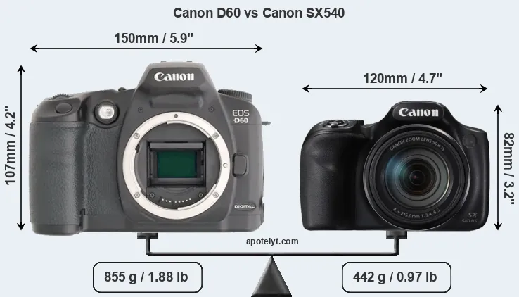 The side-by-side display below illustrates the physical size and weight of the Canon D60 and the Canon SX540. The two cameras are presented according to their relative size. Three successive views from the front, the top, and the rear are shown. All size dimensions are rounded to the nearest millimeter.