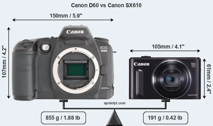 The Canon EOS-D60 and the Canon PowerShot SX610 HS are two digital cameras that were announced, respectively, in February 2002 and January 2015. The D60 is a DSLR, while the SX610 is a fixed lens compact. The cameras are based on an APS-C (D60) and a 1/2.3-inch (SX610) sensor. The D60 has a resolution of 6.3 megapixels, whereas the SX610 provides 20.2 MP.
