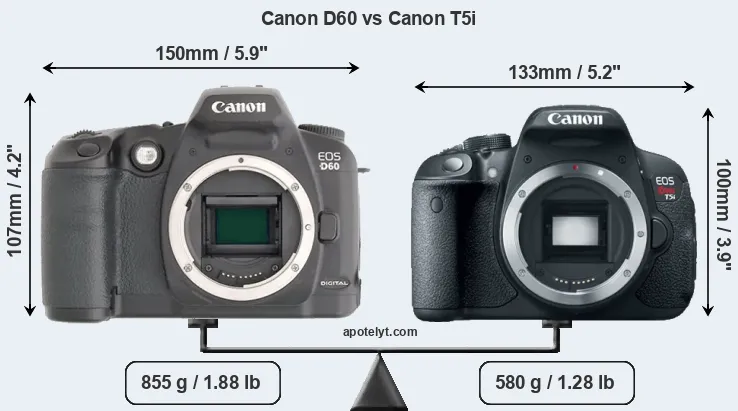 An illustration of the physical size and weight of the Canon D60 and the Canon T5i is provided in the side-by-side display below. The two cameras are presented according to their relative size. Three successive views from the front, the top, and the rear are shown. All size dimensions are rounded to the nearest millimeter.
