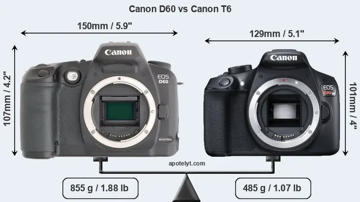 The physical size and weight of the Canon D60 and the Canon T6 are illustrated in the side-by-side display below. The two cameras are presented according to their relative size. Three successive views from the front, the top, and the rear are shown. All width, height and depth dimensions are rounded to the nearest millimeter.