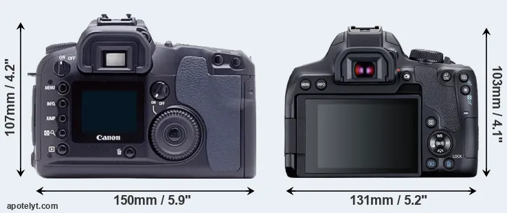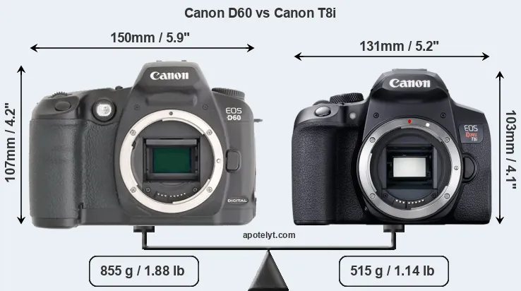 The physical size and weight of the Canon D60 and the Canon T8i are illustrated in the side-by-side display below. The two cameras are presented according to their relative size. Three consecutive views from the front, the top, and the rear side are shown. All size dimensions are rounded to the nearest millimeter.