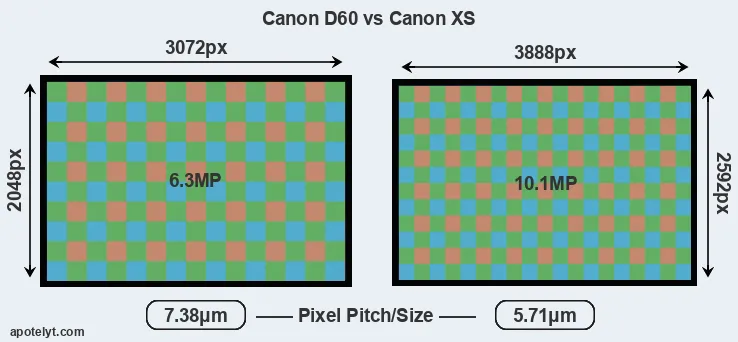 Despite having a slightly smaller sensor, the XS offers a higher resolution of 10.1 megapixels, compared with 6.3 MP of the D60. This megapixels advantage comes at the cost of a higher pixel density and a smaller size of the individual pixel (with a pixel pitch of 5.71μm versus 7.38μm for the D60). However, it should be noted that the XS is much more recent (by 6 years and 3 months) than the D60, and its sensor will have benefitted from technological advances during this time that make it possible to gather light more efficiently.