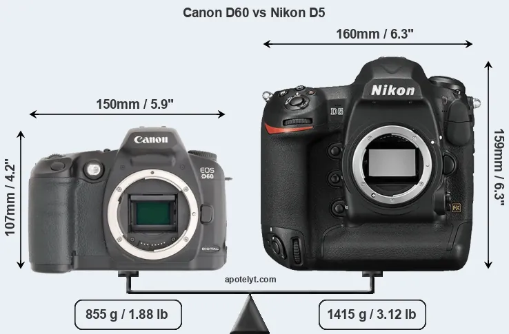If the front view area (width x height) of the cameras is taken as an aggregate measure of their size, the Nikon D5 is considerably larger (59 percent) than the Canon D60. Moreover, the D5 is substantially heavier (65 percent) than the D60. It is noteworthy in this context that the D5 is splash and dust-proof, while the D60 does not feature any corresponding weather-sealing.