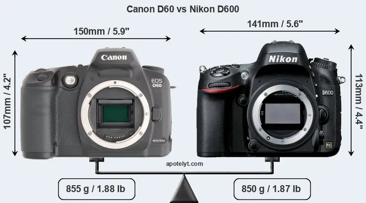 An illustration of the physical size and weight of the Canon D60 and the Nikon D600 is provided in the side-by-side display below. The two cameras are presented according to their relative size. Three consecutive views from the front, the top, and the rear side are shown. All width, height and depth dimensions are rounded to the nearest millimeter.