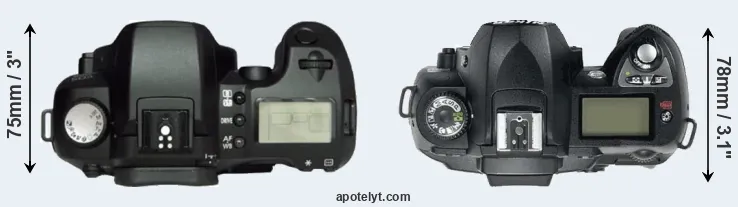 An illustration of the physical size and weight of the Canon D60 and the Nikon D70 is provided in the side-by-side display below. The two cameras are presented according to their relative size. Three consecutive views from the front, the top, and the rear side are shown. All width, height and depth dimensions are rounded to the nearest millimeter.