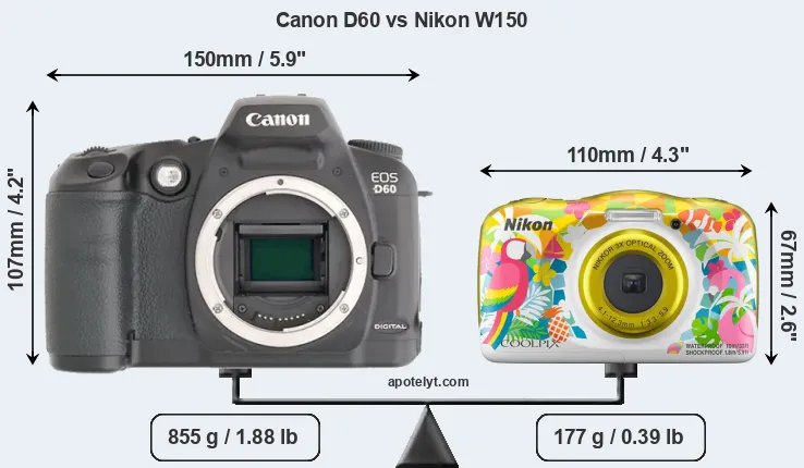 The physical size and weight of the Canon D60 and the Nikon W150 are illustrated in the side-by-side display below. The two cameras are presented according to their relative size. Three successive views from the front, the top, and the rear are shown. All width, height and depth measures are rounded to the nearest millimeter.