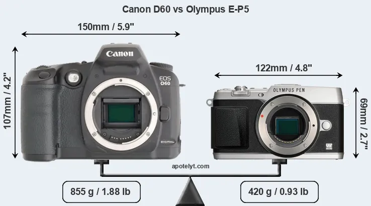 An illustration of the physical size and weight of the Canon D60 and the Olympus E-P5 is provided in the side-by-side display below. The two cameras are presented according to their relative size. Three successive views from the front, the top, and the rear are shown. All width, height and depth measures are rounded to the nearest millimeter.