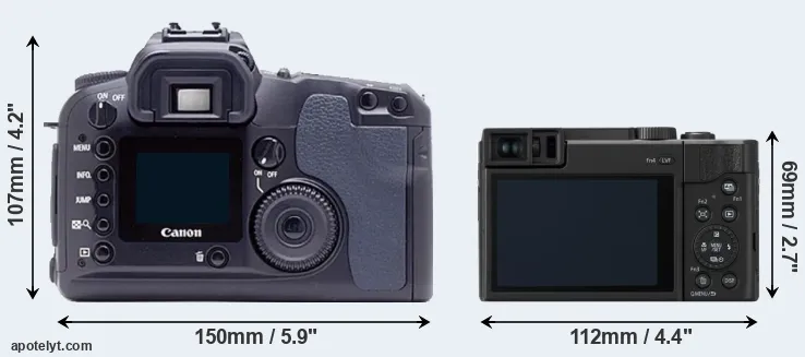 The side-by-side display below illustrates the physical size and weight of the Canon D60 and the Panasonic TZ95. The two cameras are presented according to their relative size. Three consecutive perspectives from the front, the top, and the back are available. All width, height and depth measures are rounded to the nearest millimeter.