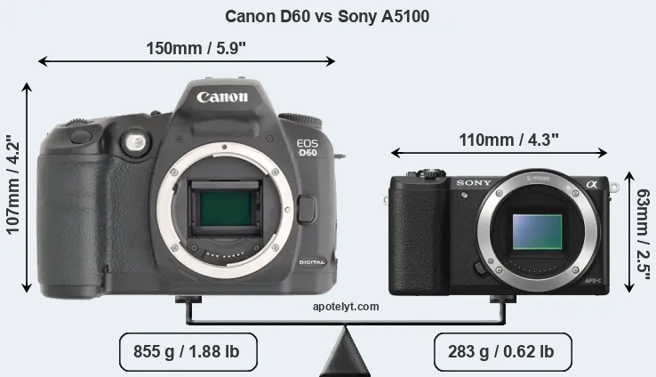 The physical size and weight of the Canon D60 and the Sony A5100 are illustrated in the side-by-side display below. The two cameras are presented according to their relative size. Three successive views from the front, the top, and the rear are shown. All size dimensions are rounded to the nearest millimeter.
