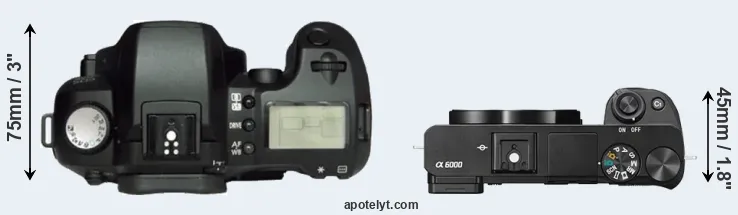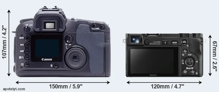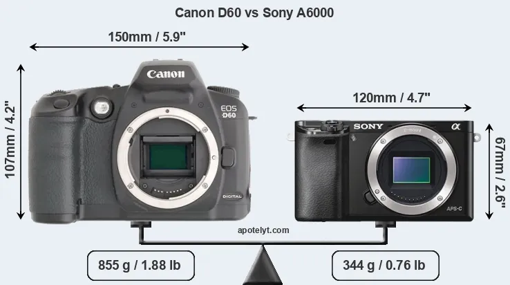 The physical size and weight of the Canon D60 and the Sony A6000 are illustrated in the side-by-side display below. The two cameras are presented according to their relative size. Three consecutive perspectives from the front, the top, and the back are available. All width, height and depth dimensions are rounded to the nearest millimeter.